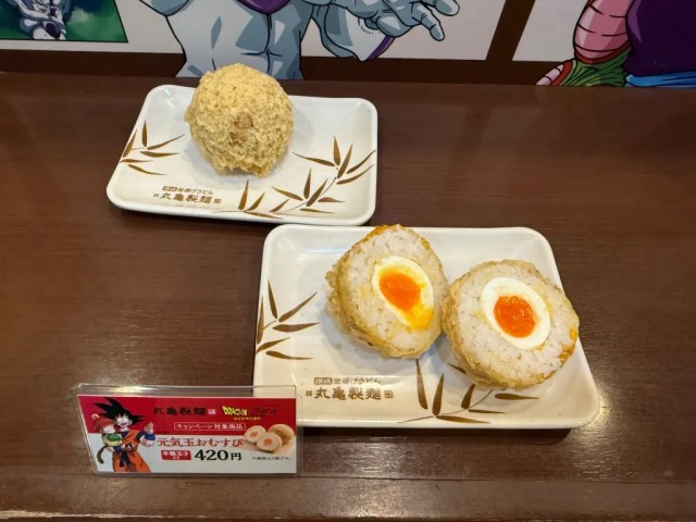 If you’re a fan, you probably recognized that the staff member in the above photo is striking the Spirit Bomb pose. That’s not just a bit of fan service, but also a reference to the Spirit Bomb Rice Balls that Marugame has created for the collaboration, a rice ball with a soft-boiled egg at the center that’s coated with tempura batter and fried to make it extra-decadent and satisfying.