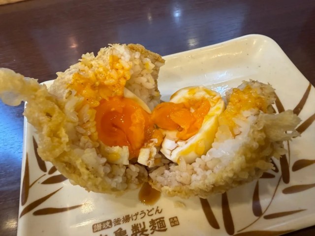 ▼ You can eat the Spirit Bomb Rice Ball as-is, but since it also qualifies as a piece of tempura, you can also dip it into the broth of any udon noodles you’re ordering at the same time.
