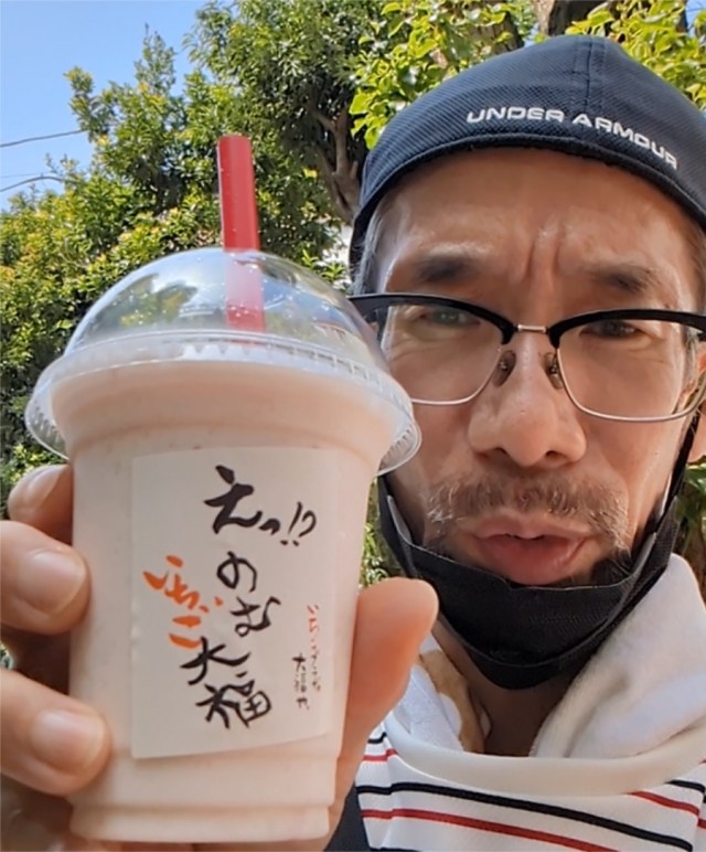 Dessert spots can also get crowded in Atami too, and Mr. Sato had a heavy heart as he passed by cream puff and pudding specialty shops with lines he’d ordinarily have been happy to wait in, if only he weren’t in a timed-distance race with one of his coworkers. Thankfully, though, he stumbled across a place called Ichigo Plaza on his way back to Atami Station that sells a “Drinkable Ichigo Daifuku,” a dessert-drink reimagining of strawberry daifuku dumpling with delicious fruit and anko (sweet red bean paste) flavors.