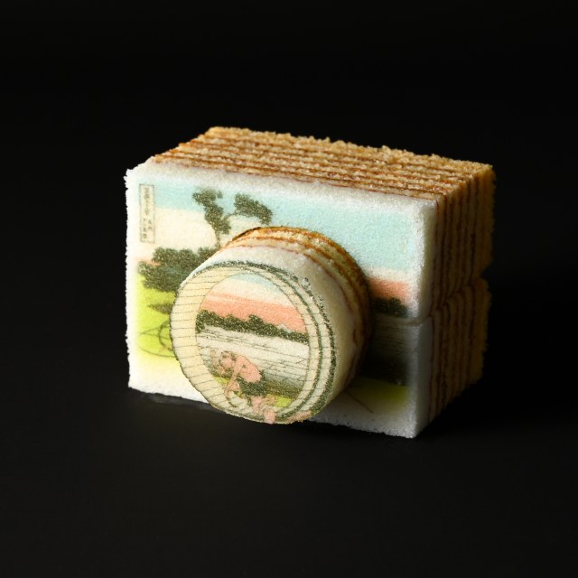 For these cakes, an additional layer of sponge cake made with egg whites is put on top. The reason for this is that the sponge cake provides a very smooth canvas for the works of Hokusai to be printed on with high-definition food printers. As a result, even the subtle gradation of colors is retained in these cakes.