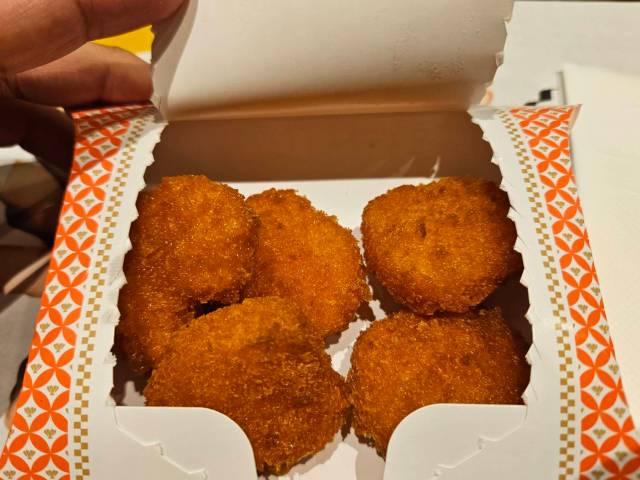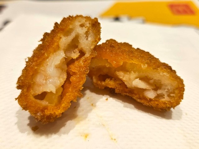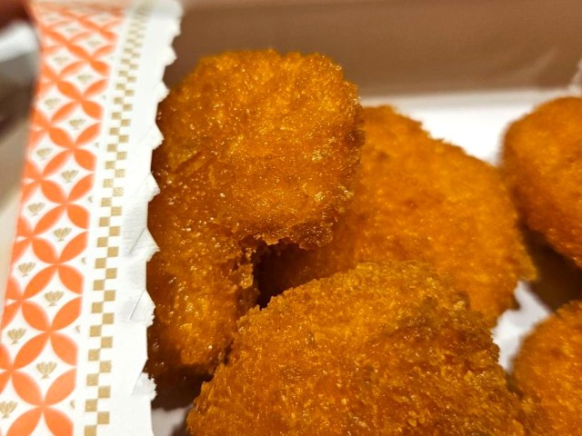 The shape turned out to be surprisingly well defined, and we could almost feel the luck emanating from it. Keeping it in the box for the time being, like a precious lucky charm, we plucked out a regular nugget and sliced it in half, where we found that the shrimp filling did look plump and jiggly. Combined with a fantastic crunch from the fried exterior, the plump texture translated beautifully on the taste buds, delivering a satisfying dose of fried shrimp throughout the palate.