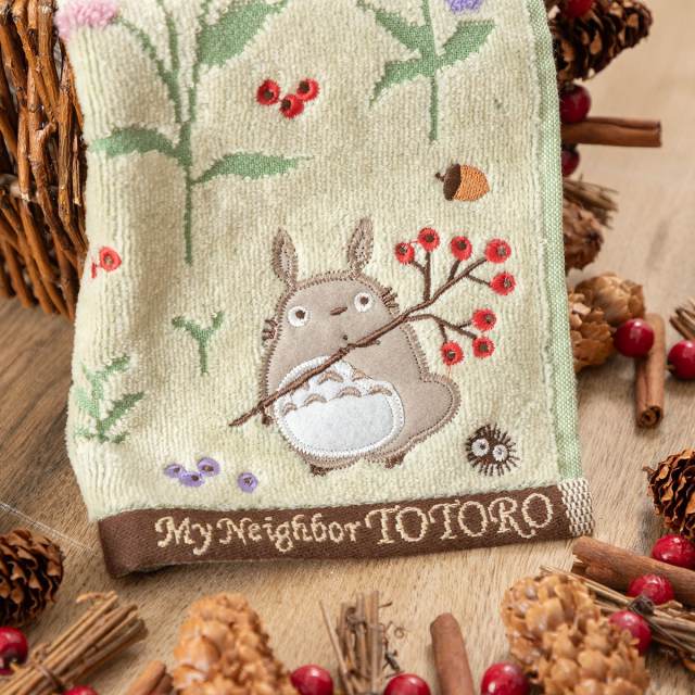 The “Autumn Moment” pattern features all three Totoros — white Small, blue Medium, and grey Large — in a gorgeous forest setting, playing with seasonal flowers and foliage, including their beloved acorns.