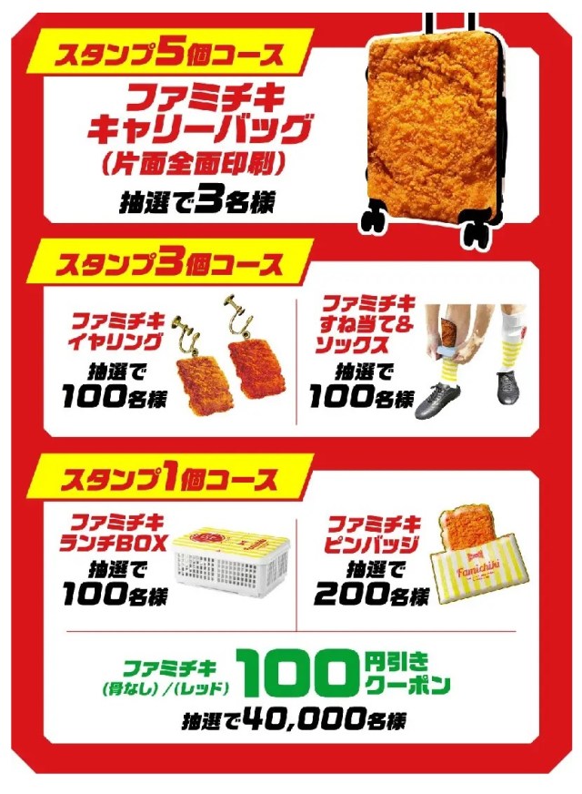Those not lucky enough to snag a seat can console themselves with the knowledge that the All-You-Can-Eat Famichiki of Your Dreams is but one aspect of Family Mart’s AgeAge fried food festival, which runs from September 16 to October 6. During that time, customers who purchase a piece of Famichiki and pay through the Fami Pay payment app can receive stamps that they can redeem for a chance at prizes such as a Famichiki-themed suitcase, earrings, socks, and pins.