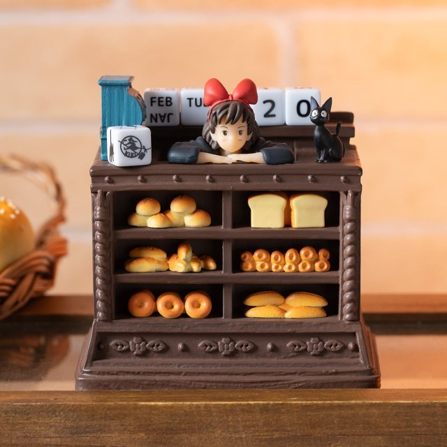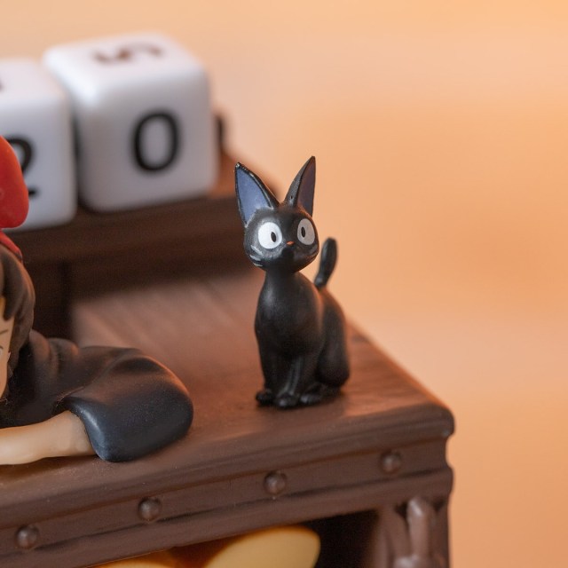 Over at the Kiki’s Delivery Service calendar figure, we find the magical courier and cat companion Jiji positioned at the bakery where they board, waiting for customers to come in with parcels to send.