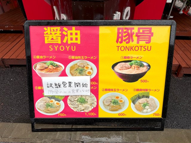 While it’s unclear whether the owner simply switched business models or a new tenant took over, it’s clear that the udon shop has now become a ramen shop, and it serves two things only: Tonkotsu Ramen and Soy Sauce (“shoyu”, written here as “syoyu”) Ramen.