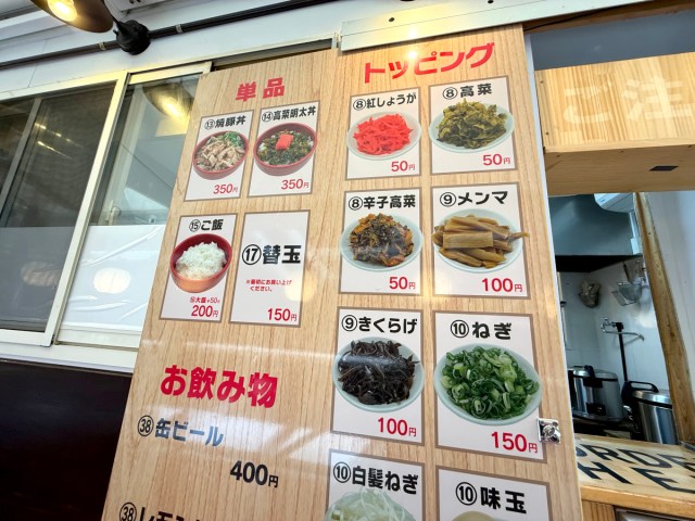 For this visit, we decided to order the most basic tonkotsu ramen so after placing our order we stood at the counter and took a look around. The sign behind us read “替玉” (“kaedama”), “生ビール” (“nama beer”) and “ハイボール” (“highball”), all at good prices that suggest this would be a good place to unwind with a drink or two, especially in the evenings.