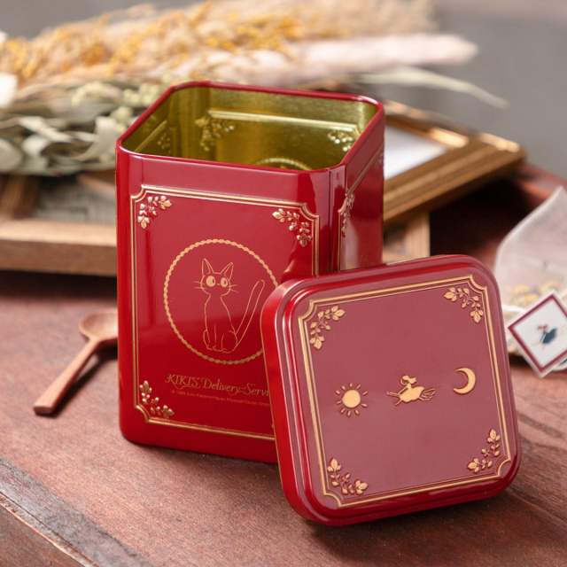 One side of the tin features Kiki’s feline friend Jiji, peering upwards and with tail upright, recalling the cat’s stance during the pre-journey bedroom packing scene.