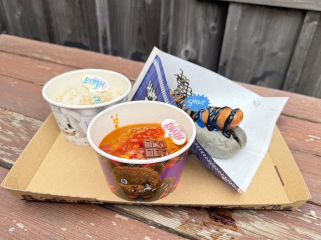 If the undeniable cuteness of Pokémon just isn’t your thing, you might appreciate the new food items based on HamiKuma, USJ’s original zombie teddy bear character (and its variants). It’s the first time that the park is selling HamiKuma-shaped popcorn buckets, which are perfect for snacking while walking around. One bucket costs 5,500 yen and comes with three sound clips as well.