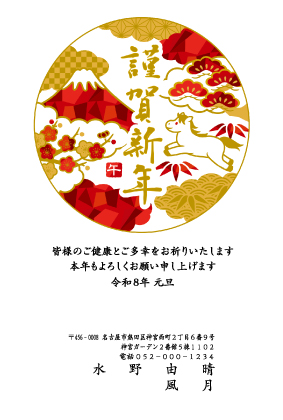 ▼ A nengajo from Futaba, picturing Mt. Fuji, cherry blossoms, and a horse
