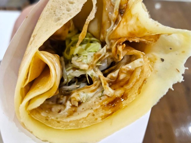 When he asked his friends how they could eat so much, they told him their hack was to eat a savoury crepe in between the sweet ones to reset the stomach. The okonomiyaki crepe in particular has a strong flavour, so it’s said to leave you craving something sweet again.