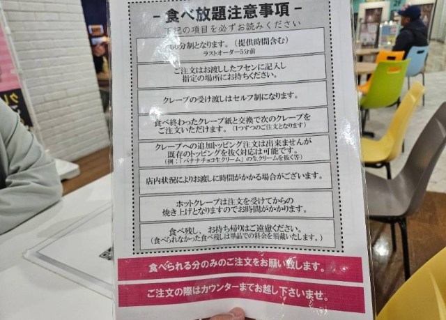 Reading through the rules, the time limit is 60 minutes, and you can only order a new crepe after finishing the one you’re eating.