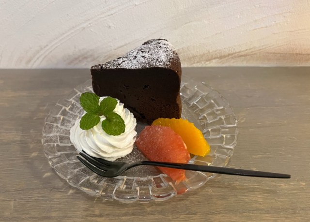 Next it was time for our cake, and Amato Danshi’s owner puts just as much effort into the presentation of his sweets. The enticingly dark brown cake contrasted elegantly with the dusting of sugar, swirl of whipped cream, and accompanying slices of citrus fruit.