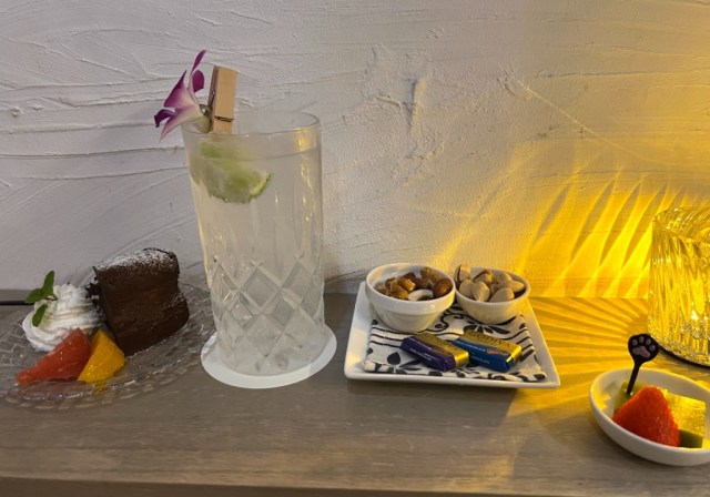We asked the owner for his recommendation, and he suggested pairing a gin and tonic, made with Okinawan craft gin Masahiro, with a slice of gateau chocolate cake.