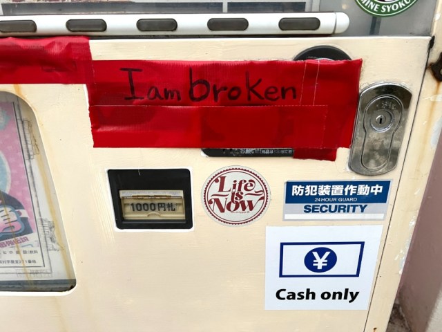 …only to find that the coin slot had been covered with tape bearing the handwritten notice “I am broken.”