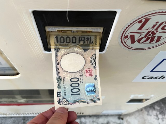OK, well the drinks couldn’t cost more than 1,000 yen (US$6.50), we figured, so next we pulled out a bill of that denomination to slide into the machine. However, the slot’s motors didn’t spring into action as we inserted the paper, so it seemed like the entire machine was broken, not just the coin slot.