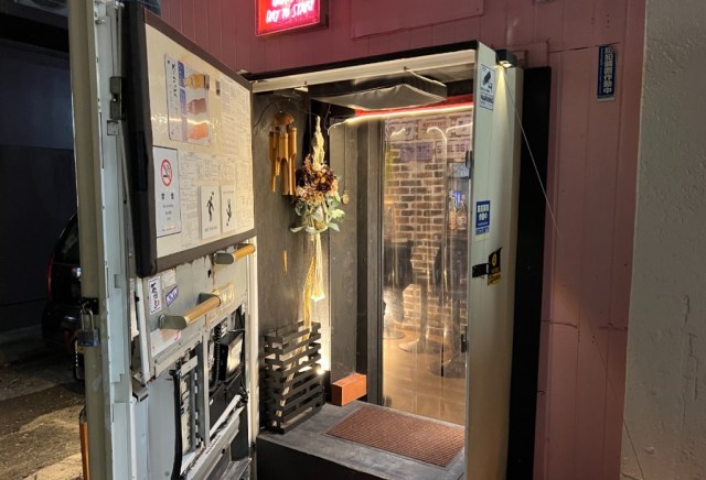 It turned out we were half right. The vending machine was as inoperable as it had been in the afternoon, in that we still couldn’t buy any drinks from it. However, it had actually been serving a different purpose all along, since the machine’s housing is the hidden entrance to a cafe/bar!